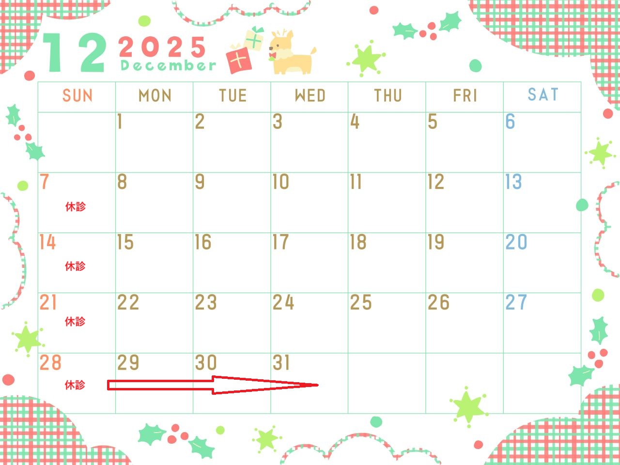 年末は28日より休診とさせて頂きます。年始は5日月曜日からの診療です!