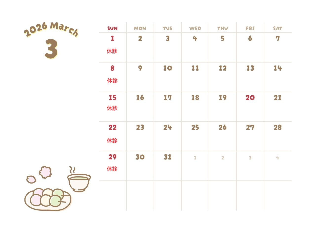 3月休診日のお知らせ。 最新情報 X Facebook はてブ LINE コピー 2026.02.27 3月休診日のお知らせです。 3月20日春分の日は土曜・祝日時間 9:00~15:00 15:00~18:00 にて診療を行っております。 天候も不安定で寒暖差の激しい日が続いております。季節の変わり目は自律神経系の不調や、関節痛の出やすい時期でもございますので 体調管理やお身体のメンテナンスをしっかり行い、気を付けてお過ごしください。
